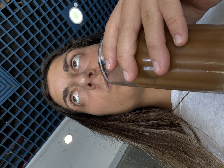 A close-up, low-angle image depicts an adult female engaged in drinking an iced beverage. The woman, positioned centrally, has long, dark-brown hair and is wearing a light-colored (likely white or light grey) t-shirt with a thin gold-colored chain necklace. Her head is tilted back, with her eyes rolled upwards towards the ceiling. Her right hand grasps a tall, clear glass containing a light brown, opaque liquid, possibly iced coffee, with visible layering at the bottom suggesting mixed ingredients. The glass is at her lips, indicating she is in the process of drinking. The background consists of a distinctive blue, grid-patterned ceiling. Two recessed circular ceiling lights are visible: one on the left emitting a warm white light, and one on the right emitting a cool white light. A plain light-colored surface is partially visible on the far left. The scene is located in Rishon LeZion, Israel.
