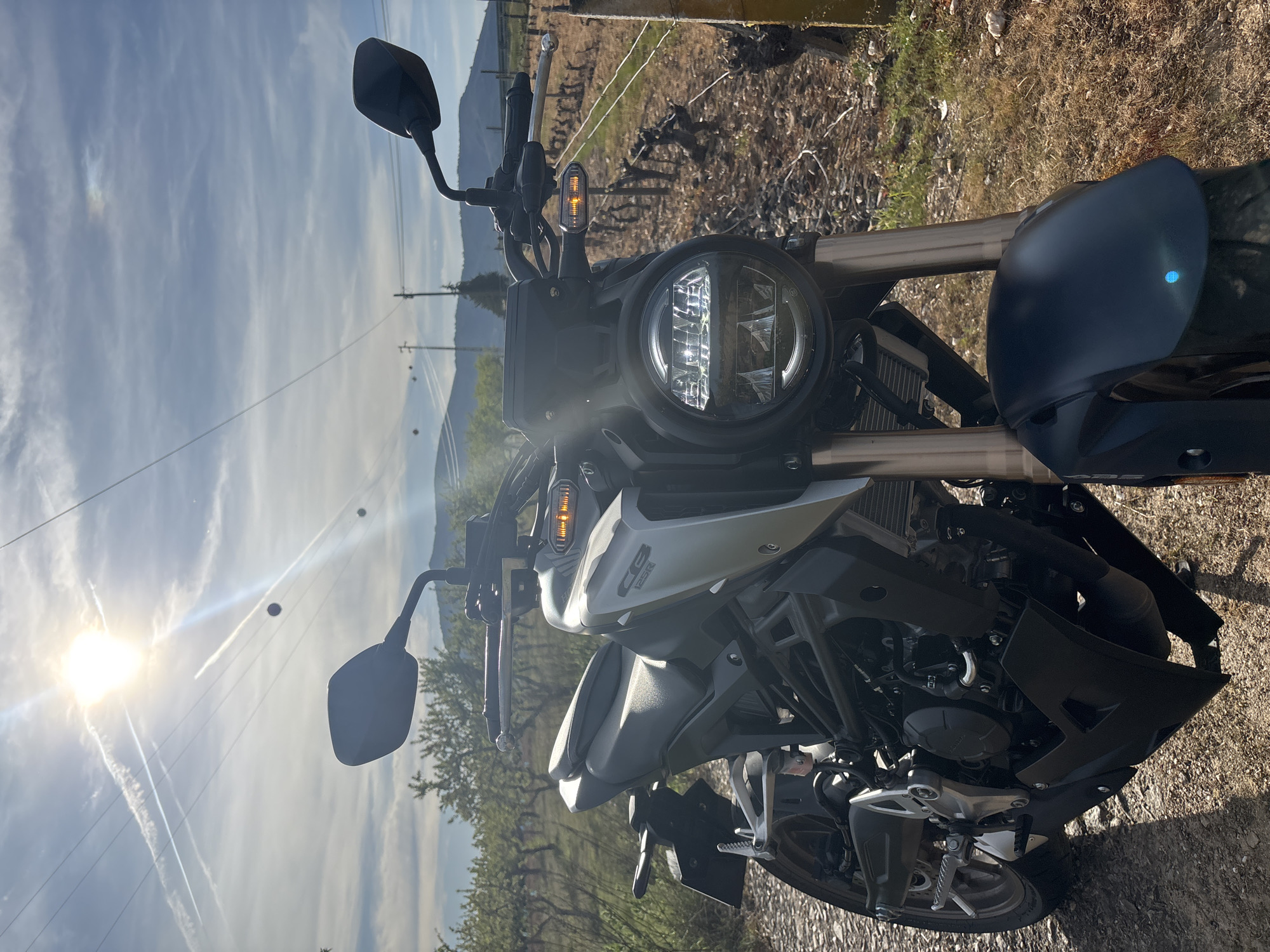 A motorcycle is parked on a dirt road next to a vineyard. The sky is bright with the sun shining intensely in the upper left corner. The motorcycle is facing the camera, showing its headlight, handlebars, mirrors, and engine. The location is likely rural due to the presence of a vineyard and mountains in the background.
