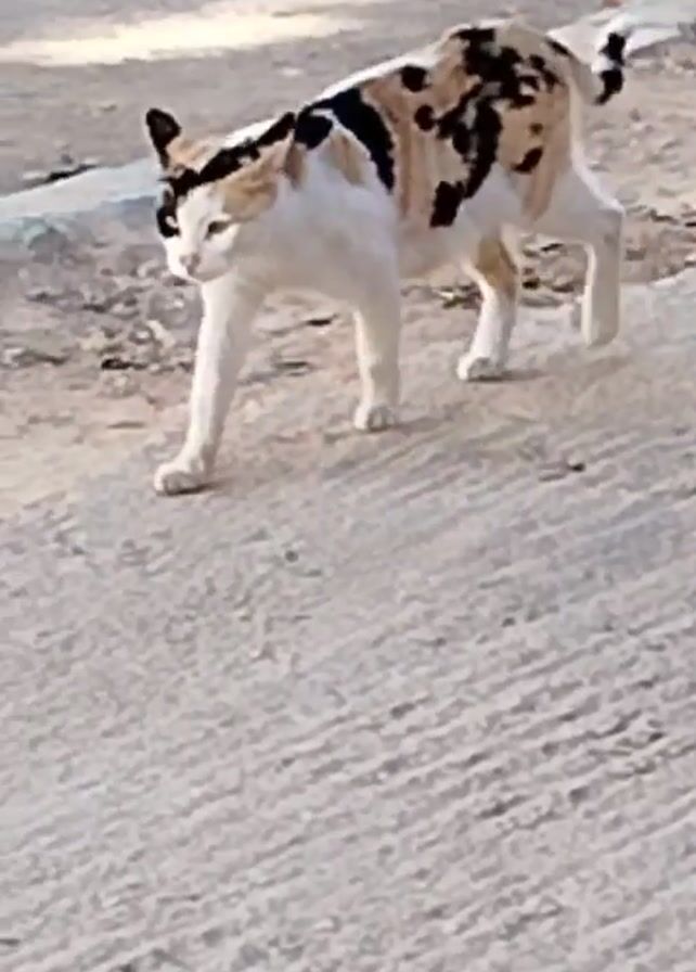 A calico cat walks from left to right on a rough concrete surface. The cat is predominantly white with black and orange patches. Its tail is thin and dark. The cat appears healthy and moves purposefully.