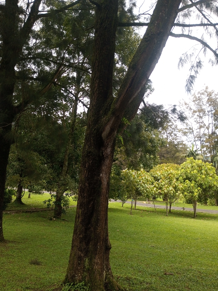 A verdant landscape showcases a lush, green lawn dotted with trees of varying sizes and foliage. Prominent in the foreground is a thick tree trunk, its bark textured and dark, partially obscuring the view. Other trees, some with lighter green leaves, line the distance. A paved pathway winds through the landscape. The scene is bathed in natural light, creating a tranquil and peaceful atmosphere.