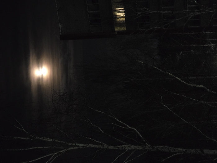 The image captures a nighttime scene in Chaikovsky, Russia. The upper portion of the frame is dominated by a dark sky, featuring a bright, vertically elongated moon diffused by thin cloud cover. Several leafless deciduous trees, identifiable by their pale, smooth bark, occupy the left and central foreground, their branches silhouetted against the darkness. To the right, a dark, multi-story building, appearing to be constructed of masonry, is partially visible. One window on an upper floor of this building emits a distinct warm, yellow light, while all other visible windows are dark. No individuals, specific actions, or direct interactions are observable within the depicted environment.