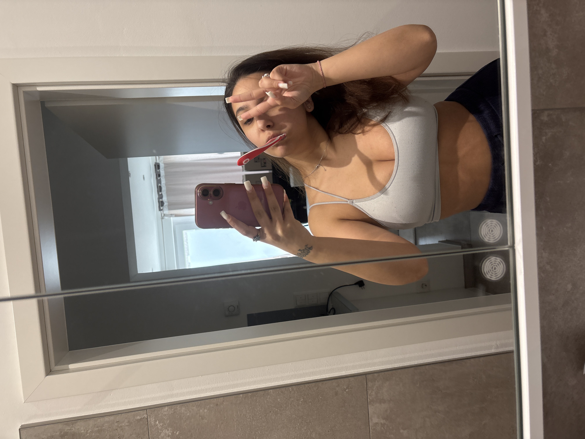 A young woman is visible through a mirror selfie, holding a red toothbrush in her mouth and making a peace sign with her other hand
