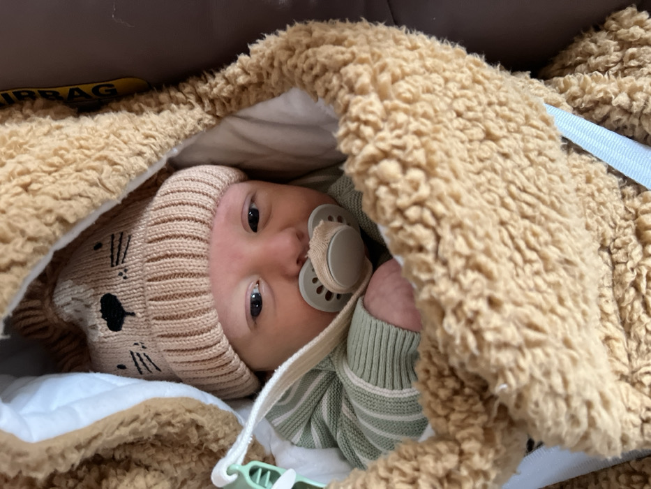 - "A baby lies nestled in a car seat or carrier lined with soft, light-colored fabric and a furry, tan blanket" by FM-YPNSq2, licensed under CC BY 4.0