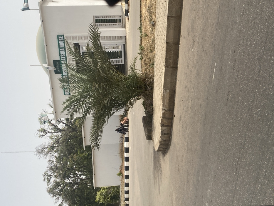 The scene depicts a brightly lit outdoor area in Unguwar Shanu, Nigeria, under a clear sky. In the foreground, an asphalt road extends left, with a light-colored concrete curb and a small paved section on the right, leading to a dry, unkempt patch of ground. A small, bushy palm tree with numerous green fronds is centrally located in this patch, partially obstructing a building in the background. To the left, beyond the palm tree, a black and white striped curb delineates the road from a paved area in front of a white wall. Two individuals are situated next to this striped curb. One person, dressed in dark clothing, is either seated or stooping low. The second individual, wearing light-colored attire, is kneeling or bent over on the ground directly in front of the first person, with their back oriented towards the viewer. Their interaction appears to be focused on an object or area at ground level. In the background, a large, white multi-story building identified by the green text "GEJ USMAN KATSINA HOUSE" is prominently visible. Arabic script is present above the English signage. The building features a light green dome on its roof and multiple white windows with vertical louvers. Two flags are mounted on the roof: a Nigerian flag on the right and a green and white flag on the left. A tall antenna or mast rises behind the building. Mature trees with green foliage are visible further in the background, behind both the building and the white wall to its left.