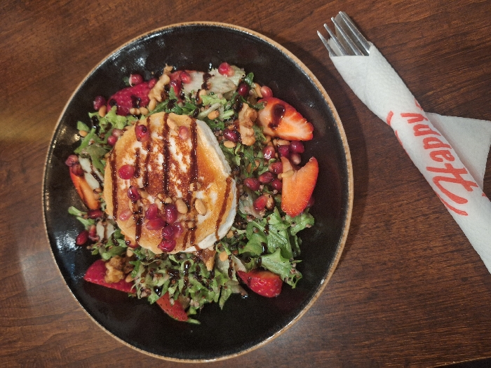 An overhead view captures a prepared salad dish on a dark brown wooden table in the city of Radinovo, Bulgaria. The salad is presented in a dark, possibly ceramic or stoneware, bowl with a textured rim. Central to the dish is a golden-brown pan-seared round of cheese, topped with scattered pomegranate seeds and pine nuts. This cheese rests on a bed of mixed green lettuce, interspersed with sliced fresh strawberries, walnuts, and additional pomegranate seeds. A dark, viscous balsamic glaze is visibly drizzled across the entire salad. To the lower right of the bowl, a silver fork is partially enclosed in a white paper napkin, which features the word "Happy" printed in red script. The wooden table exhibits a visible grain.