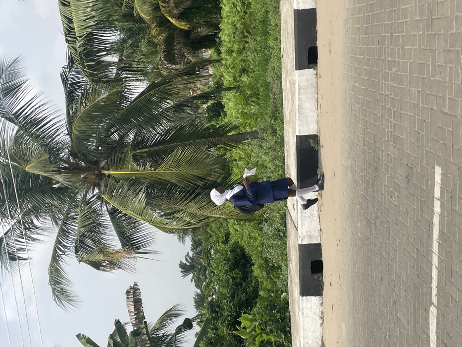 A person, appearing to be a female student, walks right-to-left on a paved sidewalk in Itoga, Nigeria