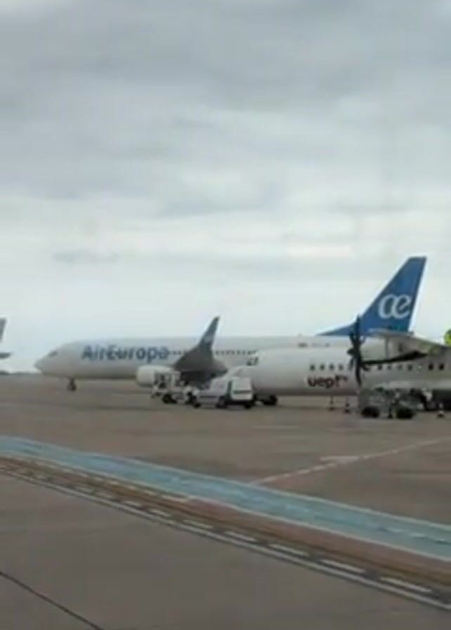 n Air Europa plane sitting on a runway on an overcast day. There are several vehicles near the plane, and other planes can be seen in the background. The video is shot from ground level. The scene appears to be at an airport, likely during the day given the natural lighting.