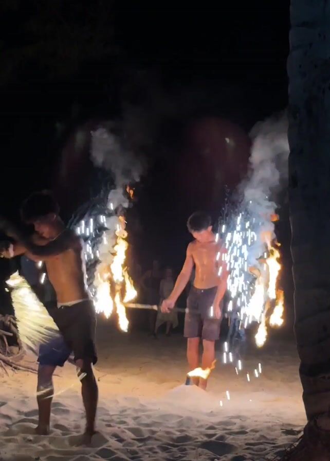 At night, on a sandy beach, two shirtless young men perform a fire dance. The man on the right twirls a horizontal bar with flames on each end, creating sparks, while the man on the left spins a flaming club. Other individuals can be seen watching in the background. A large palm tree frames the right side of the scene. A burning piece of wood lies on the ground. Electronic music plays.