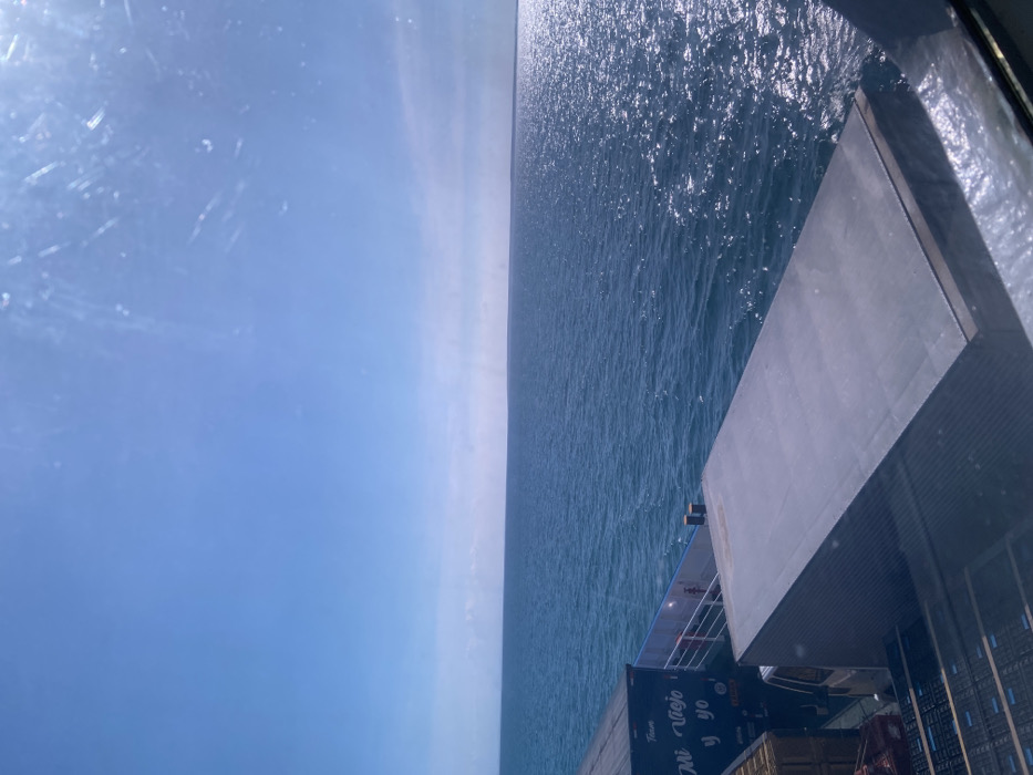 The image depicts a forensic view from within a vessel, likely a ferry, operating at sea off the coast of Punta de Piedras, Venezuela. The scene is dominated by a clear, light blue sky above, occupying the top approximately 60% of the frame, meeting a distinct horizon line. Below the horizon, an expansive body of deep blue water exhibits small ripples and surface texture. Sunlight is intensely reflected off the water's surface, particularly towards the right side of the frame, creating a shimmering effect. In the foreground, the image captures a portion of the vessel's cargo deck through a window, which displays visible scratches and glare marks, especially in the upper right. A large, dark gray, rectangular object, consistent with the roof of a cargo trailer or container, occupies the lower center and right foreground. To its left, a white railing structure is visible along the side of the vessel. Further left and slightly behind the railing, a dark blue truck trailer is partially visible, bearing white text that reads "Mi Viejo y yo". A lighter-colored vehicle, possibly a van, is discernible beneath this trailer. Two dark, short, cylindrical bollards or mooring posts are present on the deck between the large gray object and the blue trailer. The lower left corner shows a metallic grid-like surface, potentially part of a loading ramp or deck structure. No individuals are visible in the frame.