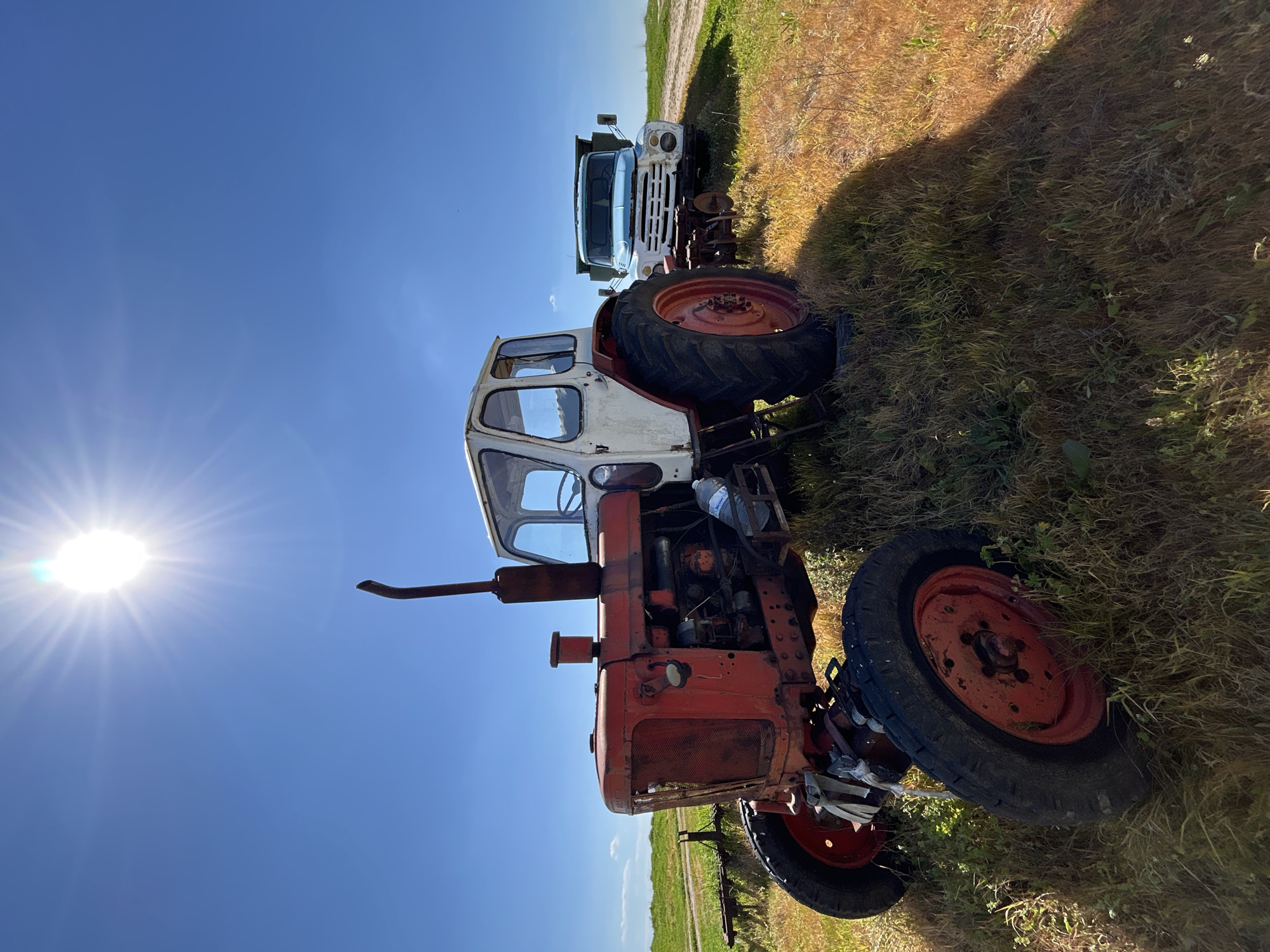 rural scene under a bright, clear blue sky with a prominent sun. A faded red and white tractor is positioned in the foreground, standing on dry grass and weeds. Behind the tractor is a light blue and white truck, also appearing aged. The location appears to be a field or agricultural area. There are no people visible in the image. The scene does not contain information regarding Vaskovo, Bulgaria.