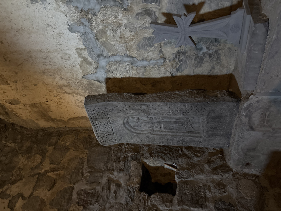 Inside a stone structure, possibly a church, a carved stone with intricate patterns and a central design resembling a cross sits atop a wall