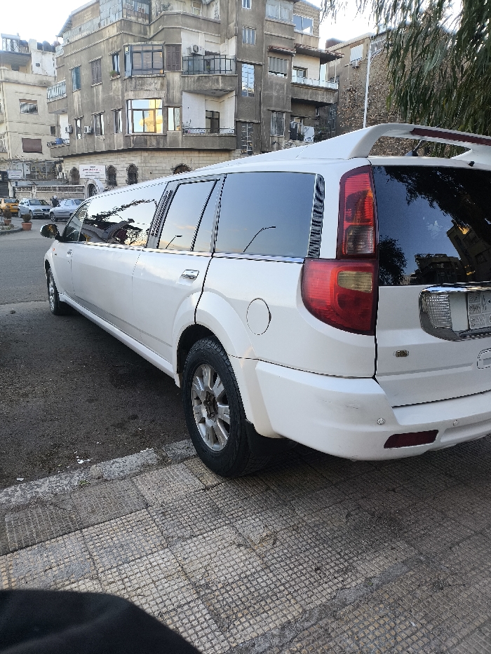 The scene is an urban street in Unknown, Unknown. A white, extended-length sport utility vehicle (SUV) or limousine is parked at an angle, displaying its rear passenger side and bumper to the viewer. The vehicle features dark-tinted windows, a roof spoiler, red taillights, and a chrome-trimmed license plate housing with visible parking sensors on the rear bumper, which exhibits minor scuffs. It rests on an asphalt road next to a textured concrete sidewalk with a grid pattern. In the background, multiple multi-story buildings of a weathered concrete and light stone construction are present, characterized by numerous windows, balconies, and external air conditioning units. Other vehicles are visible further down the street on the left. The lighting is natural, consistent with late afternoon or early morning. No individuals are clearly discernible in the immediate foreground or midground.