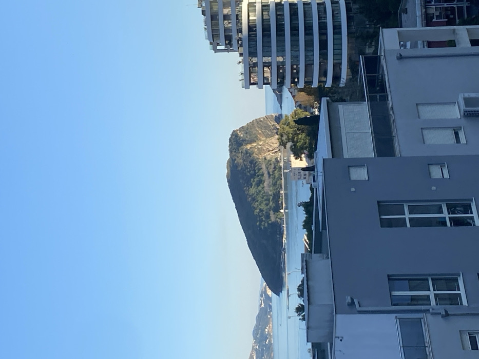 The image presents an elevated view of Budva, Montenegro, looking across Budva Bay towards Sveti Nikola Island. In the immediate foreground, a multi-story gray building occupies the lower left, characterized by rectangular windows and a balcony featuring a glass railing. An external air conditioning unit is visible on its facade. To the right, a distinctive multi-story building with a curvilinear architectural design and multiple balconies rises prominently. The midground is dominated by the calm, blue waters of Budva Bay. Sveti Nikola Island, a large landmass heavily forested with green trees and presenting a steep, rocky cliff face on its right side, is centrally located. Several small, white-hulled sailboats are discernible on the water near the island. Distant hills and coastline are visible on the left horizon. The sky is clear and bright blue. No individuals are discernible within the frame.