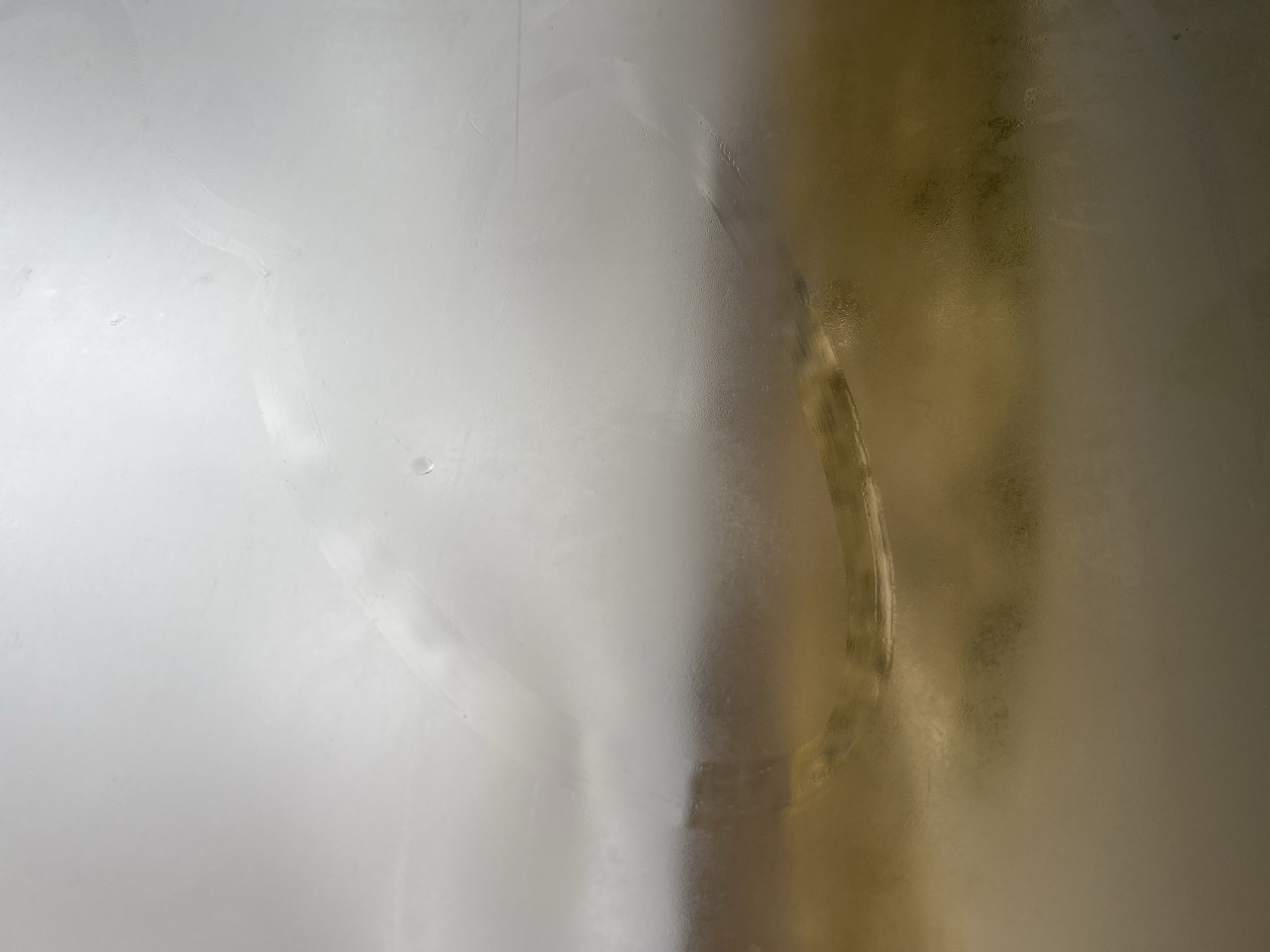 The image depicts an obscured view through a translucent surface, likely a heavily fogged or textured window, located in the Tamar Regional Council, Israel. The upper half of the frame is dominated by a light greyish-white, milky texture, featuring faint circular and curvilinear wiped marks. The lower half transitions into a muted, yellowish-brown tone, suggestive of a distant, arid landscape or dry vegetation seen through the obstruction. A prominent, clearer, horizontal arc-shaped trace is present in the lower-middle section, appearing lighter and defining a path through the obscured surface. This arc reveals slightly more detail of the yellowish-brown background within its bounds. The overall scene conveys a distant, blurred outdoor environment viewed through a moisture-laden or smudged barrier. No individuals or specific objects are clearly discernible, beyond the implied interaction that created the wiped marks on the surface.