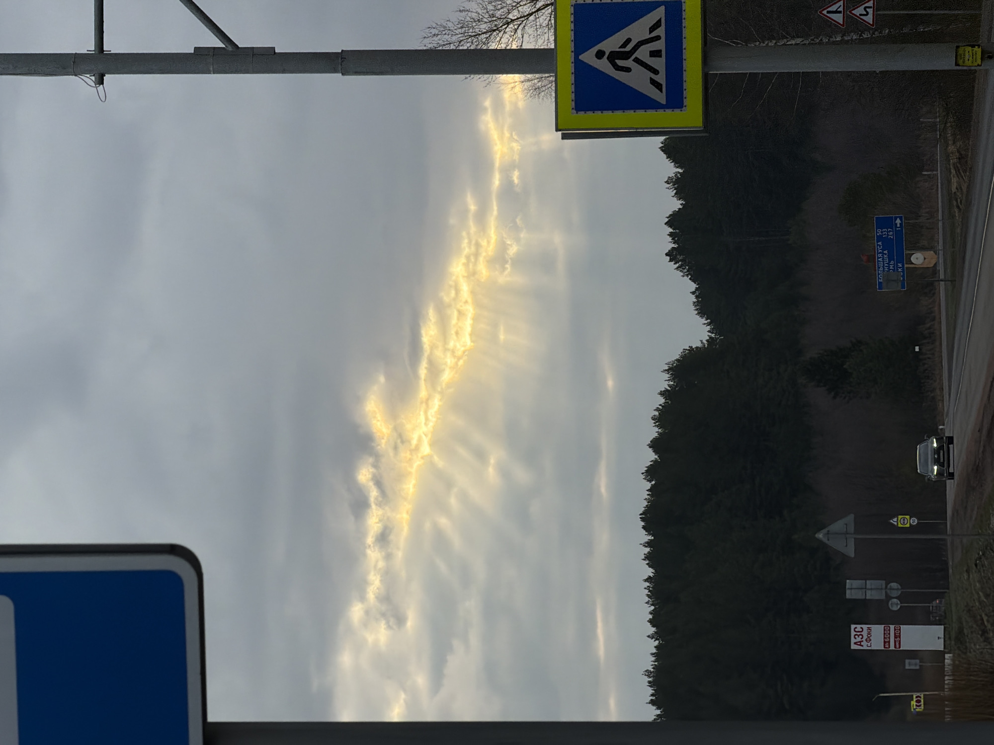 roadside scene with a view of a cloudy sky and a forest. The location is likely near Rusalevka, Russia, as indicated by the road sign. In the foreground, there are road signs, including a pedestrian crossing sign. The sky is partially obscured by clouds, but the sun's rays are breaking through, creating a dramatic lighting effect. A dense forest lines the right side of the road. In the distance, there is a petrol station. A single car is driving on the road.