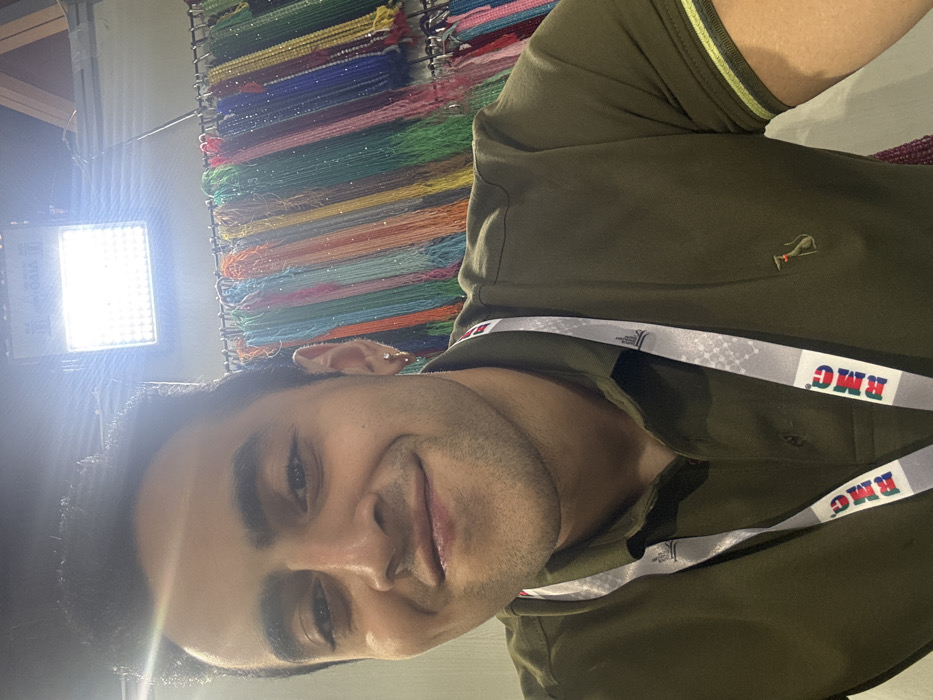 A close-up photograph features one adult male subject, estimated to be in his 20s or 30s, captured in a frontal portrait. The subject has dark hair, dark eyes, and light facial stubble, and is smiling directly at the camera. He is wearing a dark olive green short-sleeved polo shirt, which includes a small, light-colored embroidered emblem on the left chest. A white lanyard with a grey and white checkered pattern, displaying "RMC" logos in red and blue text, is worn around his neck. A small, clear stud earring is visible in his left earlobe. The background consists of numerous vertically suspended strands of colorful beads or small decorative elements, arranged in various hues such as green, blue, yellow, orange, and red, suggesting a retail environment like a market stall or exhibition booth for jewelry or craft items. A bright, square artificial light source is visible in the upper right background, creating a lens flare. The scene is situated within the city of Jaipur Municipal Corporation, India.