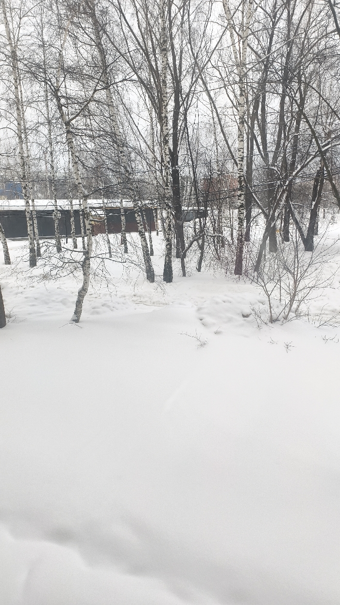 This image depicts a snow-covered outdoor scene in Chaikovsky, Russia, characterized by a dense stand of deciduous trees under an overcast sky. The foreground is entirely covered in a thick, undisturbed layer of white snow with subtle undulations. The midground features numerous bare-branched trees, predominantly birches with their distinctive white and dark bark patterns, along with some smaller, leafless bushes. A meandering path or series of footprints is visible in the snow among the trees, particularly towards the right side of the frame. In the background, partially obscured by the tree canopy, a dark, low-slung building or structure with a flat roof is discernible. Multiple utility lines or cables stretch horizontally across the upper midground. No individuals or active subjects are present in the scene. The overall environment is wintry, marked by heavy snow cover and dormant vegetation.