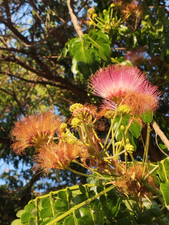 This image provides a close-up, upward-angled view of a flowering tree branch, located in the city of Guacara, Venezuela. The central focus is a cluster of distinctive flowers and buds, set against a background of green foliage, brown branches, and sections of clear blue sky. A prominent, fully bloomed flower is visible in the upper right quadrant, characterized by a spherical arrangement of numerous fine, radiating stamens that transition from vibrant pink at their tips to white at their bases. To the left and below this pink flower, several other flowers are present, displaying a feathery, orange-brown coloration, consistent with varying stages of bloom or senescence. Numerous small, round, light green buds are also clustered on slender stalks among the developing and mature flowers. The tree's foliage consists of abundant dark green, compound leaves, some sharply in focus in the foreground, particularly in the lower left, while others form a softer, blurred canopy in the background. Thicker, dark brown branches are partially visible throughout the upper and middle sections, interspersed with the leaves and sky. The scene is illuminated by strong, natural sunlight, creating highlights on the flowers and leaves and defining subtle shadows within the foliage. No human figures, animals, or man-made structures are depicted in the frame, indicating a natural, arboreal environment.