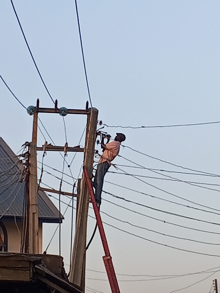 The image displays an adult male engaged in work on a utility pole in Sabon Tasha, Nigeria