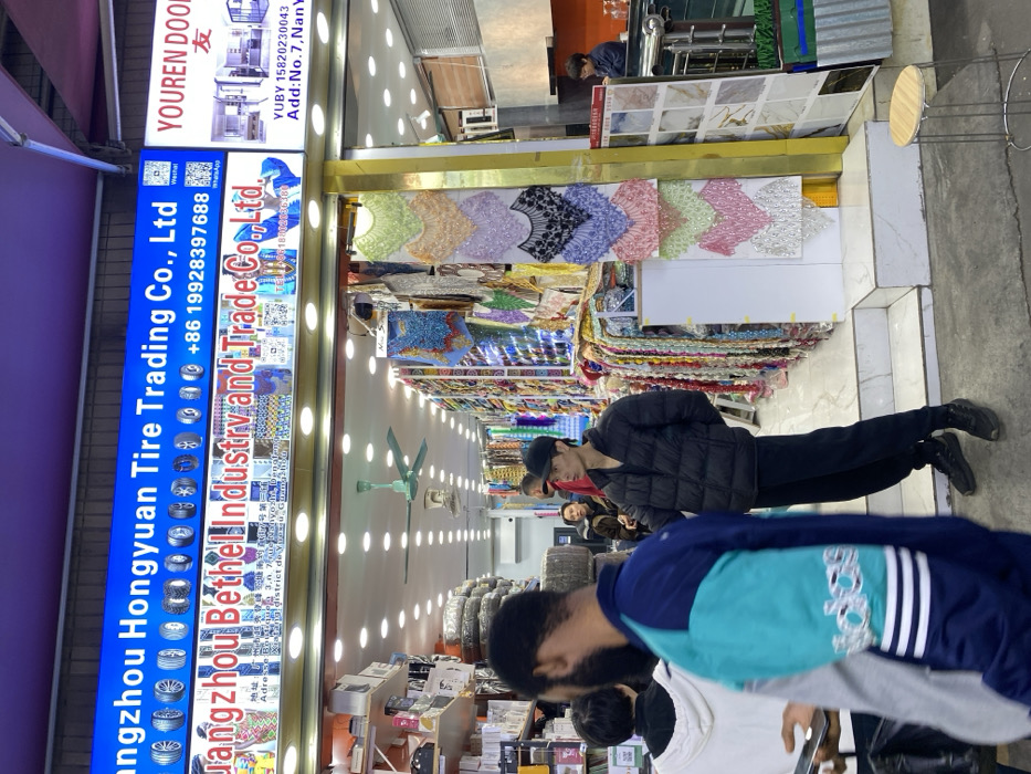 The scene depicts a busy commercial street in Yuexiu District, China, focused on the entrance of two adjacent retail establishments. **Environment:** The area is a semi-enclosed commercial corridor with multiple storefronts. Overhead, large illuminated signs are prominent. The flooring is a combination of concrete and light-colored tiles at the store entrances. Overhead lighting within the stores consists of numerous recessed spotlights and a visible teal ceiling fan. **Signage:** * A long, blue illuminated sign spanning the main width displays "Guangzhou Hongyuan Tire Trading Co., Ltd" with images of various tires and a contact number "+86 19928397688", along with QR codes for WeChat and WhatsApp. * Immediately below, another blue illuminated sign reads "Guangzhou Bethel Industry and Trade Co., Ltd" with accompanying Chinese characters, an address (partially obscured), and images depicting colorful fabric patterns and additional QR codes. * To the right, a smaller white illuminated sign for "YOUREN DOOR" (with Chinese characters for "Friend") features images of interior doors and a contact "YUBY 15828203043 Add: No.7, Nan Ya". **Central Store (left):** This shop appears to specialize in textiles or garment accessories. The interior is brightly lit, showcasing extensive racks and shelves filled with colorful fabrics, beads, and lace materials. Near the entrance on the left, stacks of dark, cylindrical objects, possibly fabric rolls or tires, are visible. **Right Store:** Partially visible, this shop has a counter near its entrance where a person is seated, facing right. A display of patterned tiles or panels is positioned on the right side of its entrance. **Individuals:** * **Foreground Left:** A male individual, partially obscured from the chest down, walks leftward. He wears a blue and teal Adidas track jacket and has a beard. His right hand holds a white smartphone. * **Foreground Center-Right:** A young East Asian male stands near the entrance of the central store, facing slightly left. He wears a black puffer jacket, black pants, black sneakers, and a black baseball cap. His hands are in his pockets. * **Mid-ground Left Store Interior:** Several individuals are present inside the central store. One person in a white hoodie is visible behind the man in the Adidas jacket, looking into the shop. Further back, a woman in a brown jacket and another individual are visible. * **Mid-ground Right Store Interior:** One person is seated behind the counter of the right store. **Objects:** A white display stand at the entrance of the central store features eight heart-shaped or V-shaped fabric appliques/necklaces in varied colors (light green, pink, purple, black lace, light blue, white, gold). A small, round wooden stool with metal legs is positioned on the concrete outside the right store's entrance.
