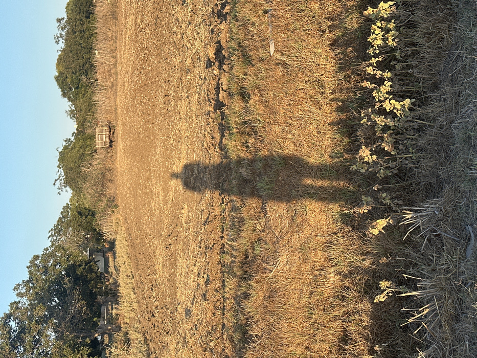 The image displays an outdoor agricultural scene located in Beit Yitzhak-Sha'ar Hefer, Israel, under clear, sunlit conditions. A distinct, elongated human shadow, oriented towards the viewer and extending from the bottom center upwards, occupies the foreground. The ground immediately beneath the shadow and to its right consists of dry, golden-brown grasses interspersed with small, low-lying plants featuring light green leaves. Beyond this grassy area, a wide expanse of tilled or fallow earth fills the midground, characterized by dark brown soil mixed with lighter dried plant remnants. In the upper-center distance, an old, wooden, open-sided trailer or cart is visible, positioned at the edge of the field near a dense line of green trees and bushes that mark the distant boundary. The sky above is a clear, light blue. The lighting indicates a low sun angle, consistent with either early morning or late afternoon.