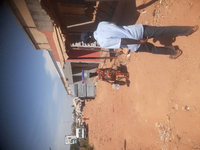 The image depicts an unpaved, reddish-brown dirt road in Jos, Nigeria, under a clear blue sky. On the right side of the frame, a man, seen from behind, wears a light blue short-sleeved shirt, dark trousers, and sandals, with a dark baseball cap. He is positioned on the edge of the dusty road, adjacent to a row of single-story buildings with varied facades, including a reddish section with a corrugated metal awning, and a gray section with a purple plastic container visible near its entrance. In the mid-ground, a woman walks towards the viewer on the dirt road. She carries a translucent purple container on her head and a black bag along with other plastic bags in her left hand. She is wearing a patterned dress. Further down the street, several indistinct figures are visible walking, alongside parked vehicles including a white van on the left. A prominent billboard with Arabic script and images is situated on the left side of the road, and a tall antenna or mast is visible in the distant background, against a hilly horizon. The ground features scattered debris and uneven terrain.