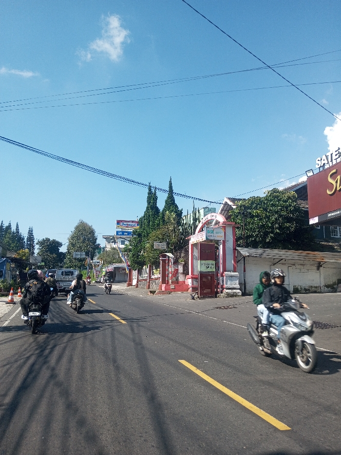 This image depicts a busy street scene on a clear, sunny day in Niz Lakuk, India. The asphalt road, marked with a continuous yellow centerline, accommodates two-way traffic. Several motorcycles are visible, with the primary focus on a silver scooter in the right foreground carrying two individuals. The driver wears a dark jacket and a light-colored helmet, while the passenger is in a green hoodie with the hood up. Further down the left lane, a motorcyclist in dark attire and a helmet, carrying a backpack, proceeds away from the viewer. Behind this motorcycle, another motorcycle and a white pickup truck are visible, along with additional vehicles in the distance. Orange traffic cones are placed on the left shoulder of the road. The right side of the street is lined with commercial buildings and dense vegetation. In the mid-ground, a large red sign with "SATE SHINTA" in white letters is prominently displayed on a building. Adjacent to it, a structure with red and white decorative pillars bears signs, including one with "BSI" and other Indonesian text. Further along the road on the right, a blue and white billboard for "Indomaret" is visible. Overhead utility lines crisscross the blue sky, which contains a few scattered white clouds. Tall, slender evergreen trees and other varied foliage are interspersed along the streetscape.