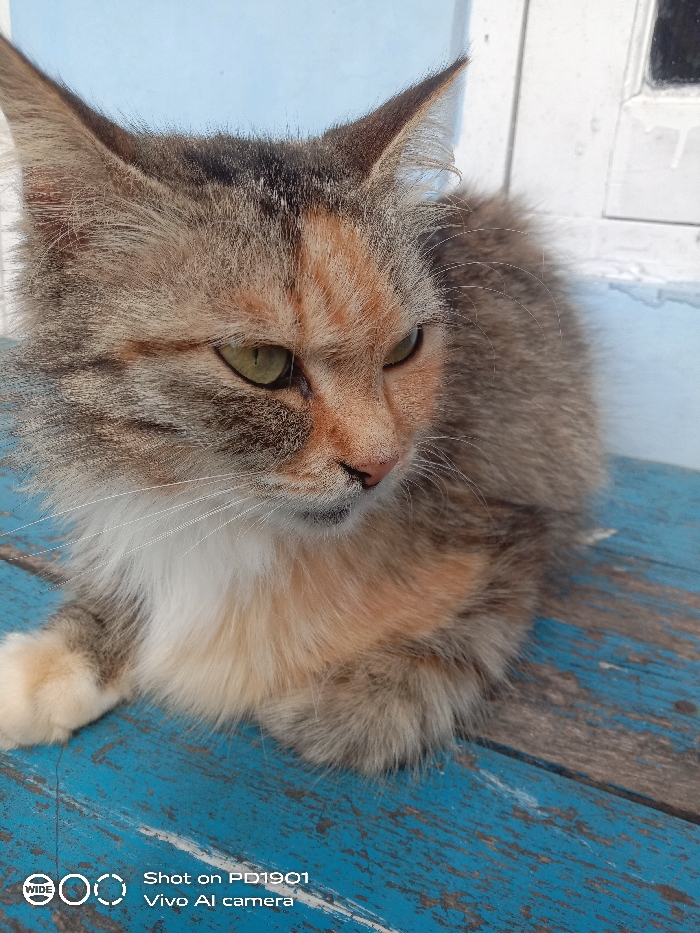 - "The image displays a domestic long-haired cat with a calico or tortoiseshell coat, exhibiting brown, grey, and black tabby markings, significant orange-ginger patches, and white fur on its chest and paws" by FM-TaKCH3, licensed under CC BY 4.0