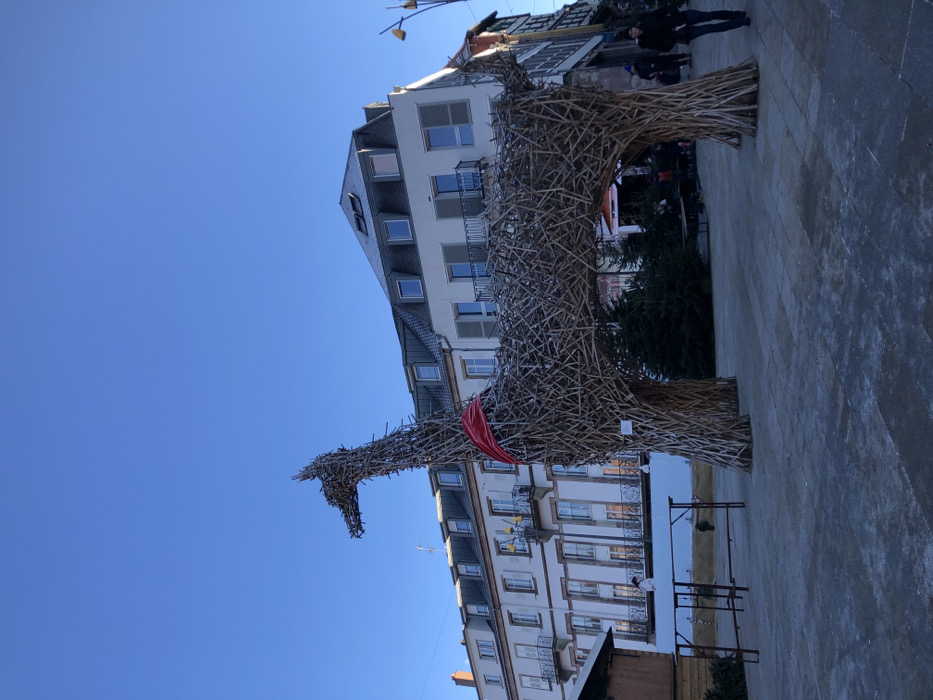 The image displays an outdoor scene in Saverne, France, under a clear blue sky. A large, stylized animal sculpture, resembling a goat and constructed from interwoven light-colored wooden branches, stands prominently in the foreground-center, facing left. A red fabric sash is wrapped around its neck. The ground is paved with light grey material, exhibiting lighter, possibly frosty, patches. In the background, a multi-story building with a light-colored facade, dark mansard roof, and multiple dormer windows is visible. It features several balconies with dark wrought iron railings. To the left of this building, another similar structure is partially visible. To the far right, a darker building with visible timber framing is present. Several small evergreen trees are positioned behind and beneath the wooden goat sculpture. On the far left of the frame, a wooden market stall-like structure is visible, along with two empty metal tables or stands in the mid-ground. One individual, wearing a white top, is partially visible behind the market stall. Further right, multiple indistinct figures are present near the evergreen trees and buildings. One individual, dressed in a dark coat, walks towards the right on the paved ground. A streetlamp with two circular yellow lights is partially visible on the far right. The scene is brightly lit by natural daylight.