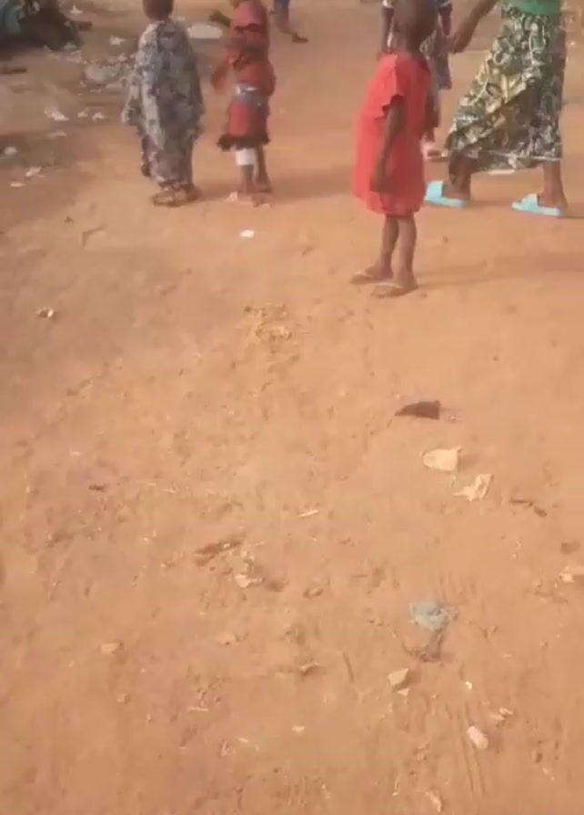 group of children and adults in what appears to be a village or rural setting. The ground is reddish-brown, suggesting a dirt road or open area. Several children, some wearing colorful dresses and one in a red dress, are standing and moving slightly to music in the background. An adult is walking nearby carrying a bucket. Other adults are visible in the background, either sitting or walking. The environment has buildings and a car, with some trash scattered around.
