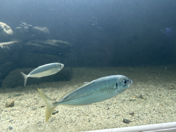 The image displays an underwater scene within an aquarium, identified as being located at the Varna Aquarium in Varna, Bulgaria. Two fish, consistent with a species of horse mackerel (genus *Trachurus*), are present. The prominent foreground fish, positioned centrally and slightly to the right, exhibits a silvery-blue body with a distinct black spot behind its operculum and a yellowish caudal fin. It is oriented horizontally, swimming to the right. A second, smaller fish of the same species is visible in the mid-background, positioned higher and to the left of the foreground subject, also facing right. The aquatic environment features a light tan sandy bottom with scattered small detritus. The background consists of dark blue water with indistinct dark rock formations partially visible on the left side. Fine particulate matter is suspended throughout the water column. A light-colored structural bar or ledge is visible at the bottom edge of the frame, indicating the base of the aquarium tank. No human subjects are visible.