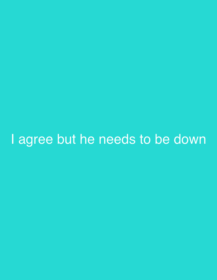 The image displays a solid turquoise background (approximate hex #20C2BA). Centered horizontally in the lower middle portion of the frame, white sans-serif text reads: "I agree but he needs to be down". No people, physical objects, specific actions, or environmental features are depicted. The scene, contextually identified as being in the city of Montigny-le-Bretonneux, France, contains no visual elements to confirm or indicate a physical location within that city.