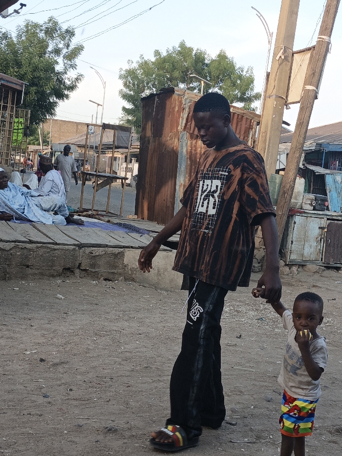 The image depicts a daytime scene on an unpaved, dusty street in Gwagwarwa, Nigeria. In the foreground, a tall male with dark skin and short black hair walks towards the viewer's right, looking downwards and to his right. He wears a brown and black tie-dye t-shirt with a white "123" graphic, black pants with a white vertical stripe on the outer seam, and black sandals with red, yellow, and green straps. He holds the right hand of a small child, also with dark skin, who stands to his immediate right. The child wears a light-colored t-shirt and colorful shorts with what appears to be an "Angry Birds" pattern, and is eating a light-colored, possibly yellow, food item held to their mouth. The child looks directly towards the camera. In the mid-ground to the left, several adult males in light-colored traditional Nigerian garments are visible. Two are seated on a raised concrete platform topped with wooden planks, while another stands further back. Further down the street, another man in a light garment walks away from the camera. The background features various makeshift structures, including several rusted corrugated metal shacks or stalls, some dark brown and others painted light blue, flanking the street. Wooden frames for stalls are also visible. Green trees are interspersed among the structures. An off-white utility pole with attached wires and a solar-powered street light fixture rises on the right side of the frame. The sky is clear and light.