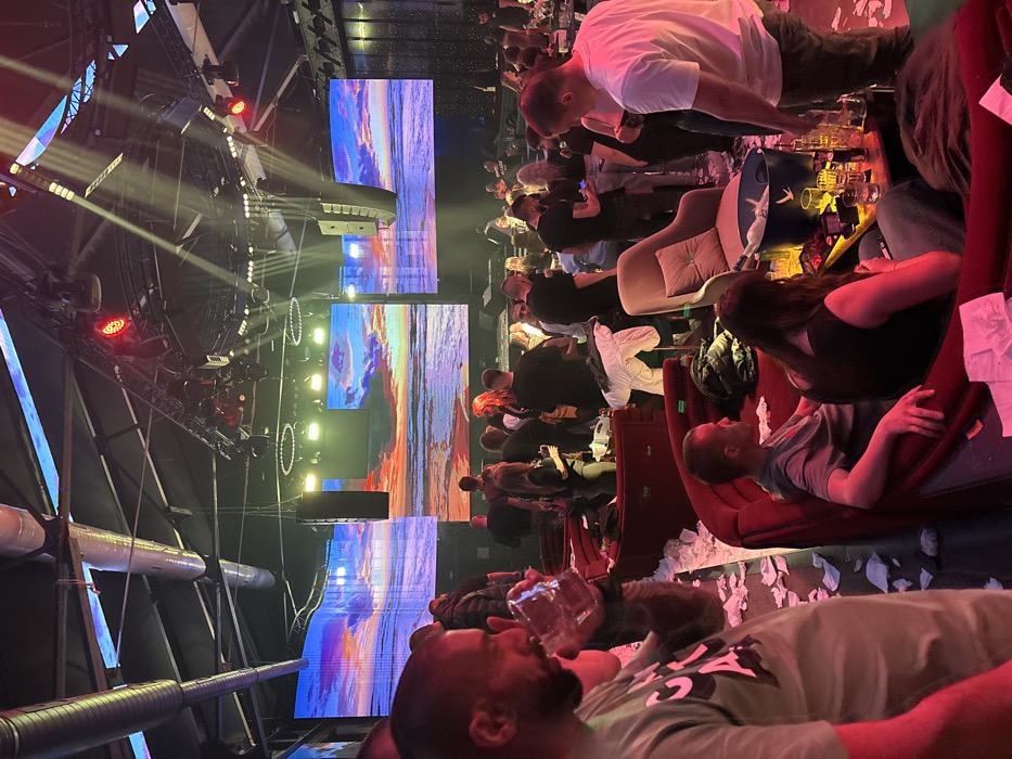 The image captures the interior of a crowded nightclub or lounge, identified as Bar Tequila in Burgas, Bulgaria. The primary visual features include a series of large, multi-panel LED screens on the far wall displaying a vibrant sunset or sunrise beach scene with water and sky. The ceiling, characterized by dark industrial trusses and exposed ventilation ductwork, supports a complex lighting system comprising numerous stage lights, including red spotlights and moving head fixtures, casting visible light beams through the ambient darkness. The floor and various pieces of furniture are significantly littered with small, crumpled pieces of white paper. The seating arrangements consist of prominent curved, deep red upholstered booths and individual lounge chairs, one of which is beige and positioned in the mid-ground. Small, round tables are placed between seating areas, holding bottles (including a large bottle of Grey Goose vodka in a blue ice bucket), assorted drinking glasses, and mobile phones. Approximately 25 to 30 individuals, predominantly young adults, are present in the scene. In the immediate foreground on the left, a man with a beard, wearing a light-colored t-shirt, is visible from the chest up, holding a clear glass to his mouth as if drinking. His face is illuminated by a reddish light source. In the mid-ground, a man in a grey t-shirt and a woman with long, dark hair are seated in a red booth, appearing to look towards the right of the frame. Other individuals are standing throughout the venue, conversing, holding drinks, or observing the surroundings. Their attire is casual club wear. The overall environment is one of a lively, social gathering.