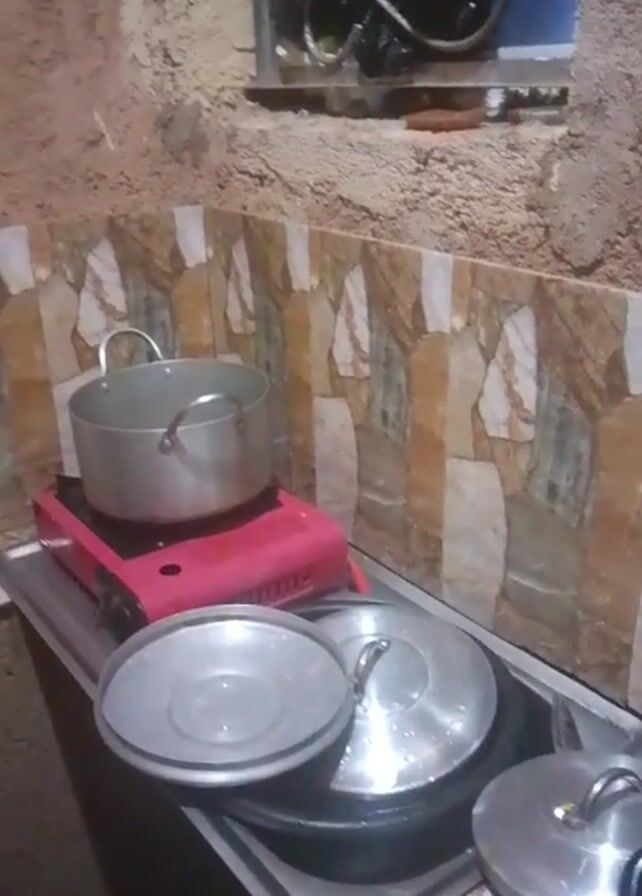 kitchen area with a stainless steel sink containing a black pot with a lid, a separate lid, and a container of chopped onions and other items. A large silver pot sits on a red portable stove on the counter, and a barred window is visible in the background, near a wall with tan and white patterned tiles. The overall lighting is dim.