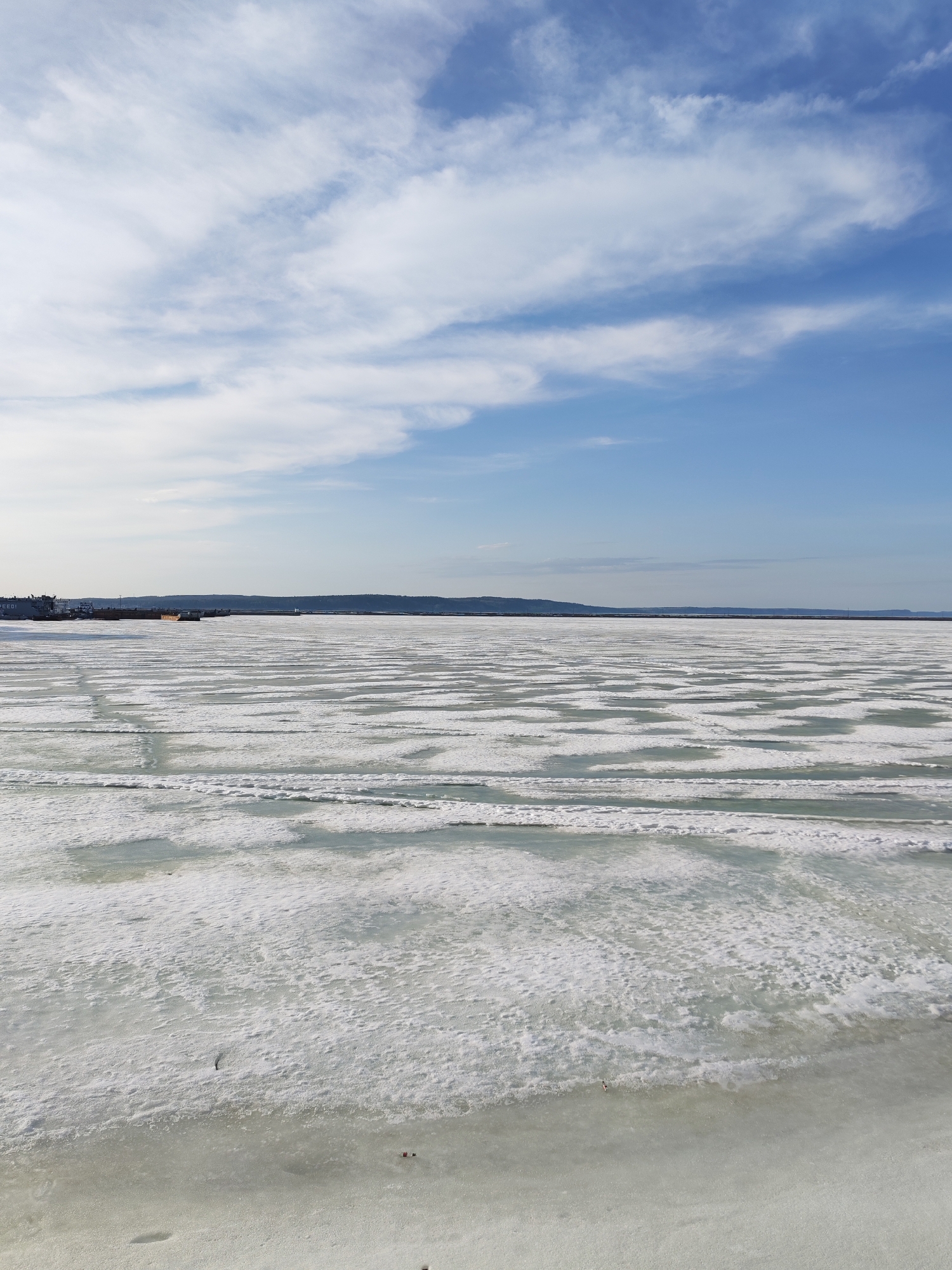 The image depicts a wide expanse of frozen water, likely a large body of water like a lake or river, in Chaikovsky, Russia. The ice surface is predominantly white, with varying degrees of thickness, and horizontal, linear separations possibly caused by freezing patterns or melting. The sky is blue with scattered white clouds, and in the background, there is a distant shoreline with some buildings and land vegetation visible.