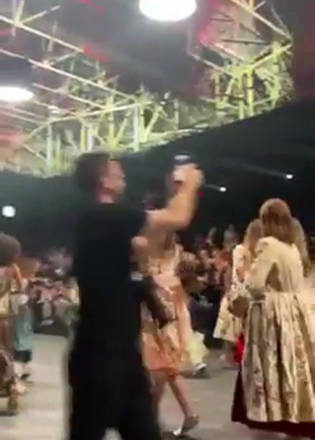 group of young women dancing in a large, industrial-looking event space. The space has a high ceiling with exposed beams and bright, round lights. Many people are seated in the background, watching the performance. The dancers are dressed in light-colored, patterned outfits, and they move in a circular formation, holding hands and stepping to the music. A man walks through the foreground of the shot, partially obscuring the view. The overall atmosphere appears lively and celebratory.