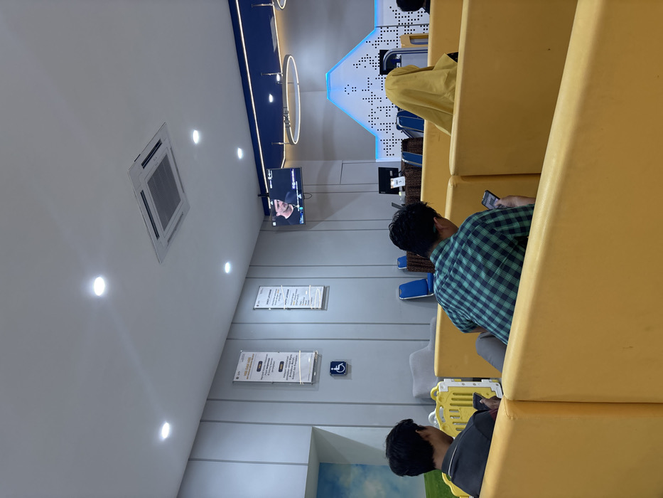 A waiting room features rows of yellow seating with occupants absorbed in their phones. Wall-mounted documents and a television showing a man's face add to the ambiance. Overhead, recessed lighting and a large square vent illuminate the space. Blue accents and a geometric design adorn a distant wall, creating a modern aesthetic.