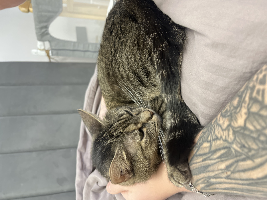 - "The scene is an indoor setting in Akulovo (Gp Kubinka), Russia, depicting a domestic tabby cat resting on a human arm" by FM-Wibut2, licensed under CC BY 4.0