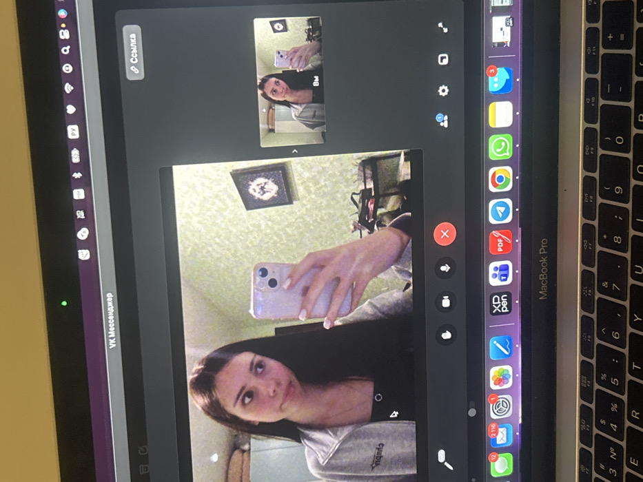 A MacBook Pro laptop screen displays a VK Messenger video call interface, located in Kudrovo, Russia