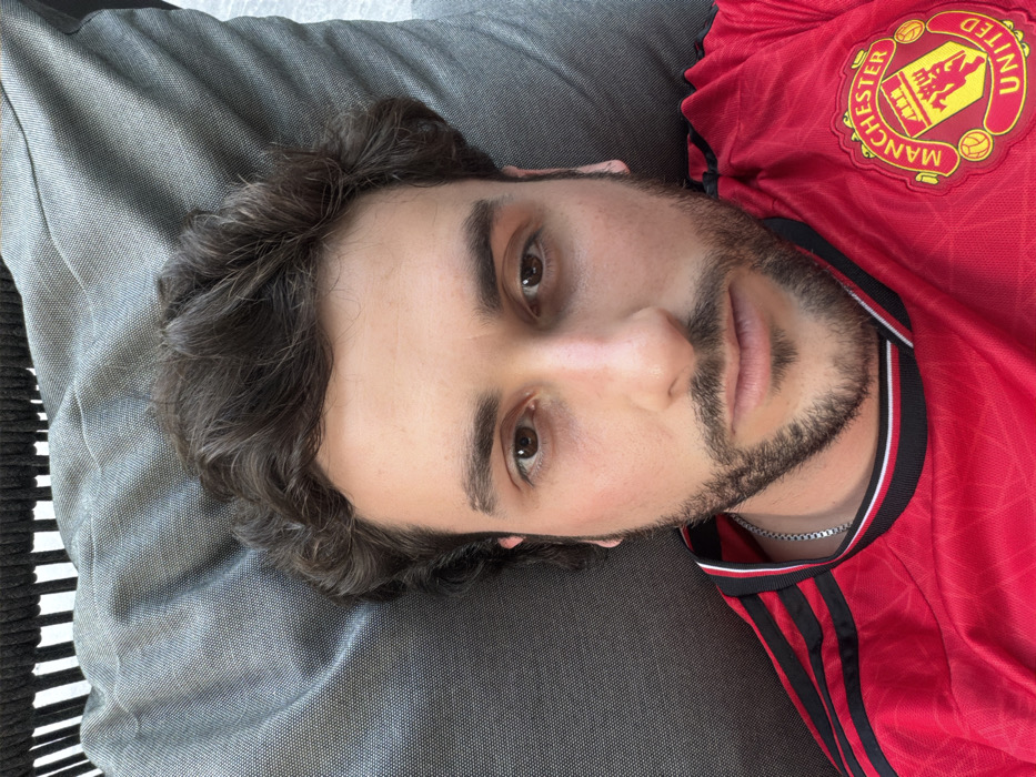 A man reclines, his head resting on a gray surface, presumably a pillow or cushion. He is wearing a red Manchester United jersey, the team's crest clearly visible on his upper right. He has dark hair, a light beard, and brown eyes. A silver chain necklace is visible at his collar. The overall lighting suggests an indoor setting.