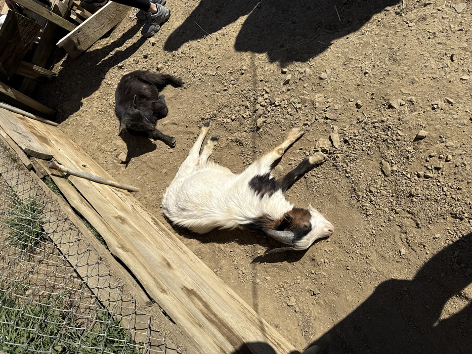 This image depicts an outdoor enclosure in Leskovets, Bulgaria, under direct sunlight. Two goats are resting on a dry, light brown dirt ground containing small rocks. A primarily white goat with black and brown markings is lying on its left side in the foreground, facing left, with visible horns. Behind it, a smaller, entirely black goat is lying down, positioned further to the right. A rough wooden barrier extends along the left side of the frame, behind which a chain-link fence and green grass are visible. A metal rod leans against the wooden barrier. In the upper right corner, the lower legs and feet, wearing grey athletic shoes, of a human subject are present, casting distinct shadows across the dirt, alongside other elongated shadows from unseen objects or individuals.