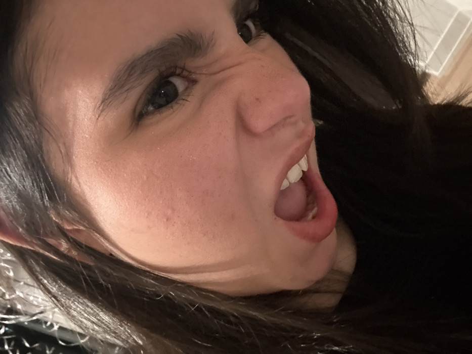 The image displays a close-up, high-angle, and tilted view of an individual's face, primarily the right side, against a dark, out-of-focus background. The subject has long, dark hair, visible around the left and top edges of the frame. The skin tone is fair to medium, exhibiting visible pores and minor texture on the cheek and nose. The right eye is prominent, featuring a dark iris, visible eyelashes, and distinct crow's feet wrinkles extending from the outer corner, indicative of an intense or strained expression. The nose is slightly wrinkled, and the mouth is wide open, revealing both upper and lower teeth and the tongue, suggesting a yell, shout, or strong vocalization. The lips are reddish-pink. A dark garment, possibly a shirt, is visible around the lower neck and shoulder area. A faint light-colored line, consistent with a baseboard or trim, is observable in the bottom right corner, suggesting an indoor setting. The lighting appears somewhat dim, with illumination focused on the face. There are no discernible features in the image to determine a specific location within the city of Austin, United States of America.