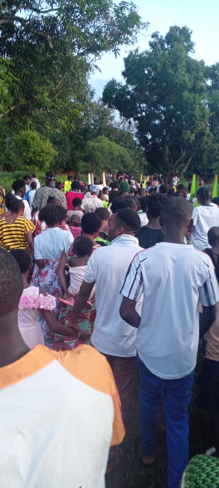 A dense crowd of people moves forward, their backs to the viewer. Various styles of clothing are visible, including striped shirts, patterned dresses, and white shirts with jeans. Lush green trees frame the scene above the heads of the people, partially obscuring the sky. The overall impression is a gathering or procession in a natural setting, possibly an outdoor event.