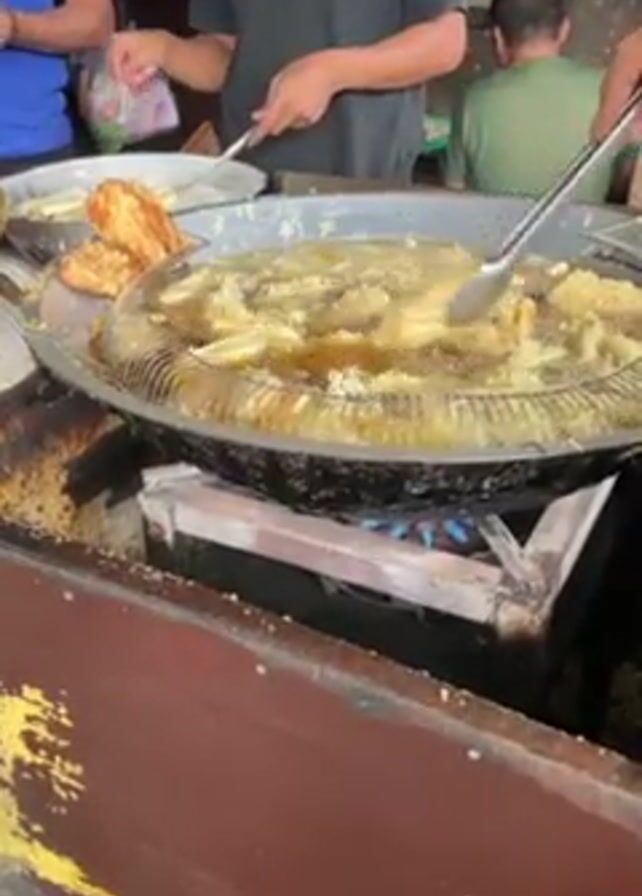 food stall where several people are preparing and cooking food. A large, round pan filled with bubbling oil sits on a burner with a blue flame. In the oil, pieces of food, likely bananas, are being fried. A person wearing a black t-shirt with yellow writing is using a pair of tongs to turn the food in the oil. To the left, another person in a blue shirt is handling what appears to be already-fried food. The stall itself looks well-worn with a mix of gold and dark brown coloring. Several other individuals are present but partially out of view. The scene gives the impression of a busy street food vendor preparing fried bananas.