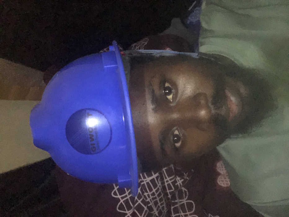 A dark-skinned male subject is depicted in a medium shot, facing the camera directly with a neutral expression. He is wearing a blue hard hat, which features a circular logo on the front displaying "GIWOT" text, partially obscured by a bright reflection. Beneath the hard hat, he wears a light green t-shirt. The background on the left side of the frame shows a patterned fabric, possibly bedding, with light and dark elements. The background on the right is darker and indistinct. The lighting is dim, with a prominent light source creating a glare on the hard hat. The specific location within the city of Jos, Nigeria, is not discernible from the visual content of the image.