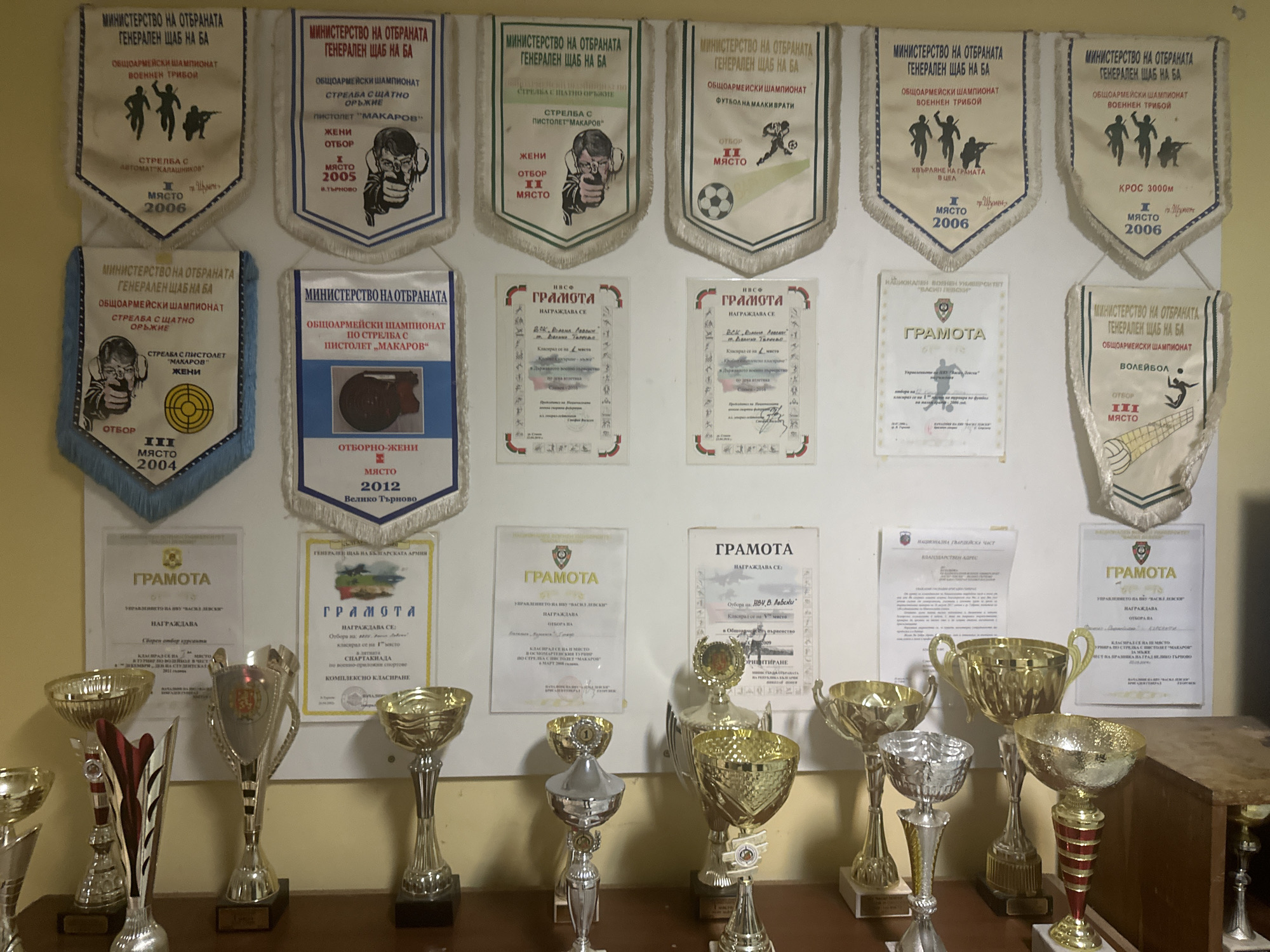 The image displays an interior scene within Veliko Tarnovo, Bulgaria, showcasing a collection of military sports and academic awards