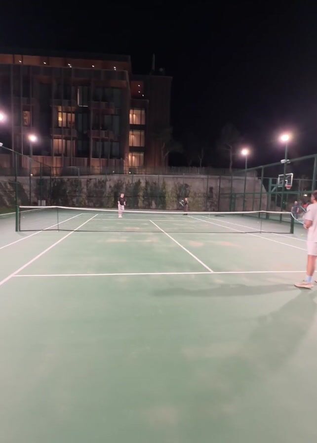 nighttime tennis match on an outdoor court. The camera appears to be handheld and positioned on the court, slightly behind one of the players. The court surface is green with white lines. There is a net dividing the court into two sides, and two players are visible on the opposite side. One player is closer to the net, while the other is further back. A tennis racquet can be briefly seen in the foreground, indicating the perspective of the player holding the camera. There is a umpire chair by the court. There are lights illuminating the court. In the background, there are trees and a multi-story building with visible windows.