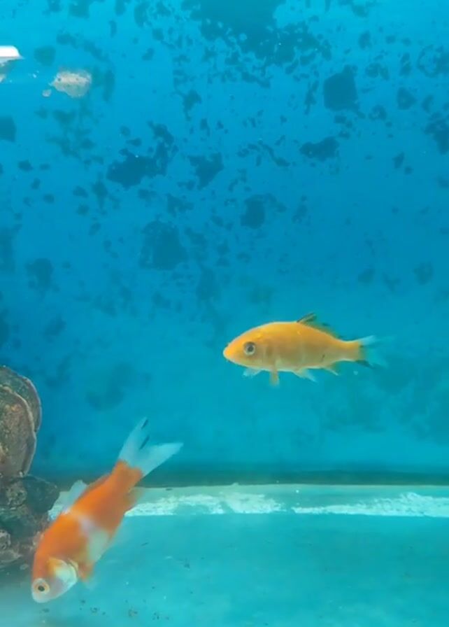 few goldfish swimming in an aquarium. One goldfish is orange and white, and the others are just orange. There's a rock decoration with holes in it on the bottom of the tank. The water is a murky light blue. The background of the aquarium is a darker blue with various splotches.