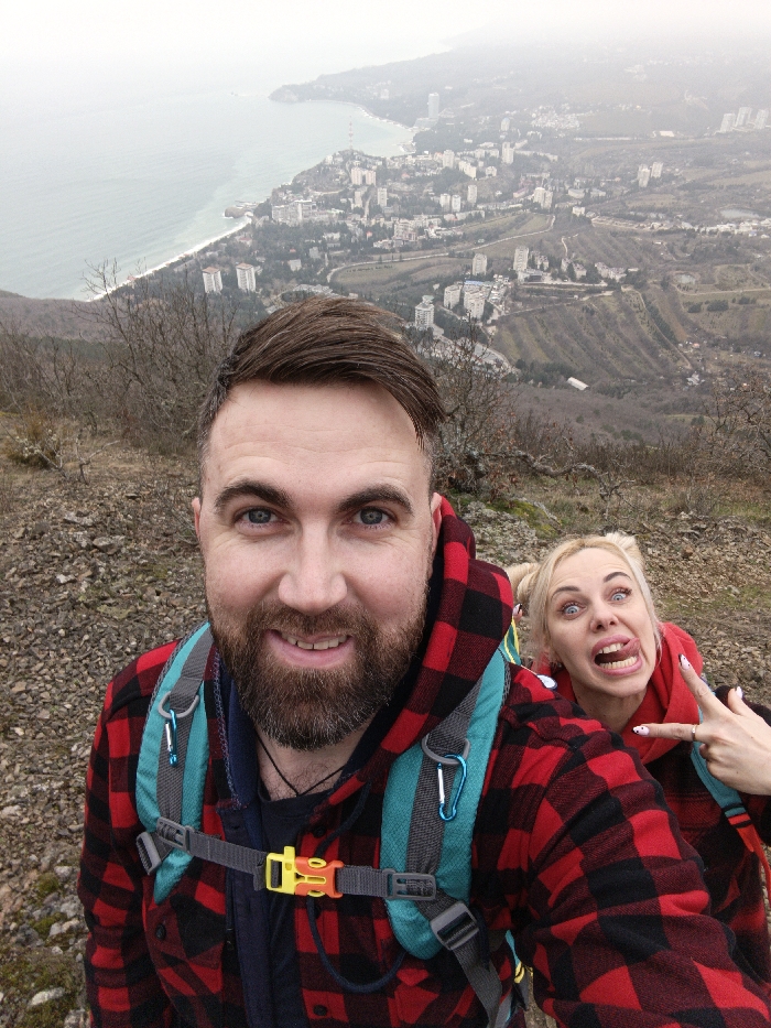 A high-angle selfie captures two individuals on a rocky hillside overlooking the city of Partenit, Ukraine, under an overcast sky
